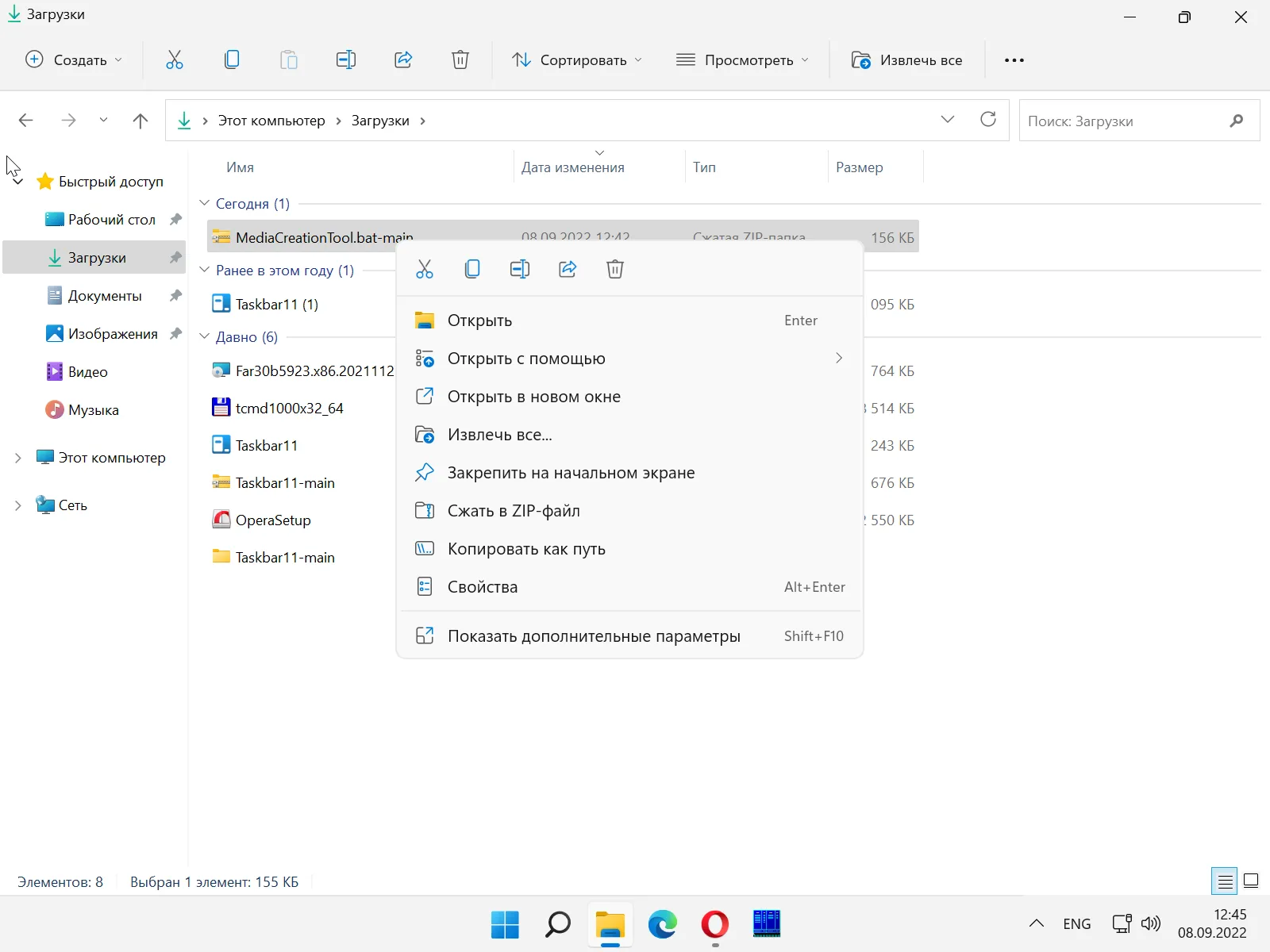 После завершения загрузки перейдите в папку, куда был сохранен файл. По умолчанию Windows 11 сохраняет скачанные файлы в каталоге «Загрузки». Кликните по скачанному ZIP-архиву правой кнопкой мыши. Выберите из меню «Извлечь все».