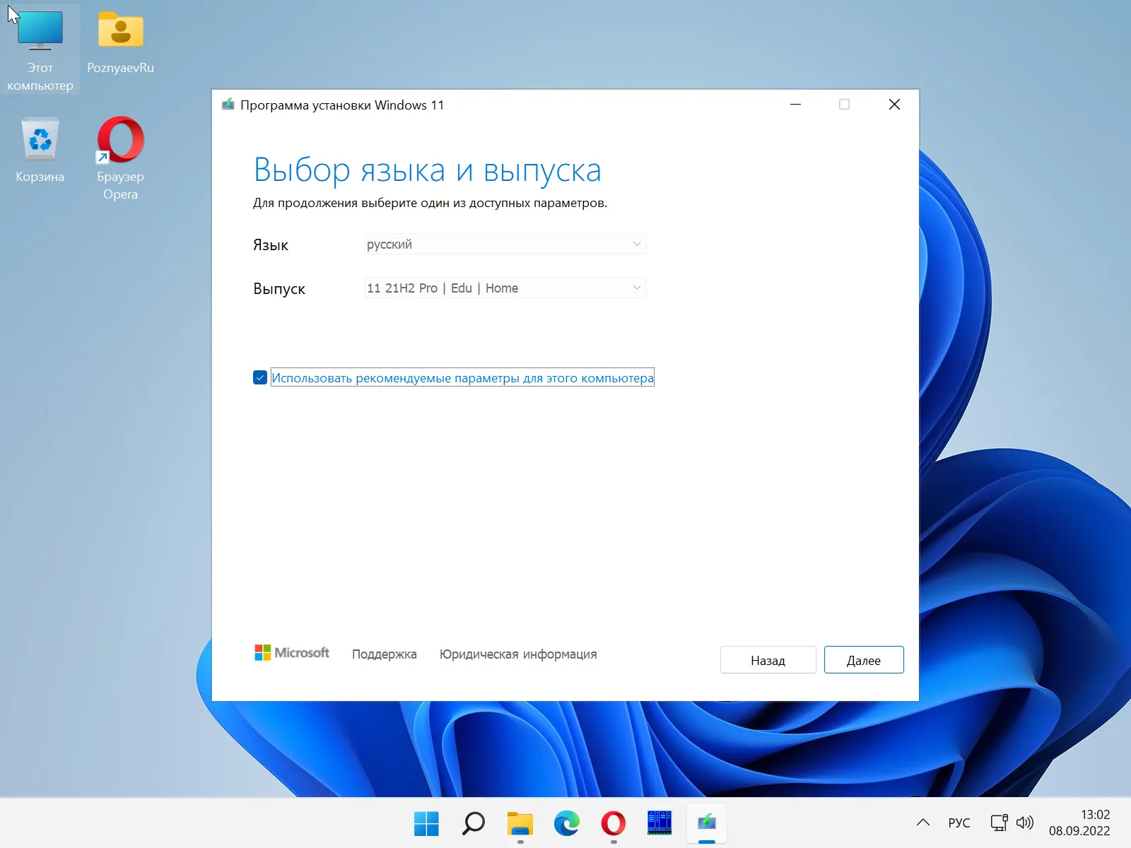 Снимите «галочку» «Использовать рекомендуемые параметры для этого компьютера». Выберите язык и версию (выпуск) ОС из соответствующих списков. Нажмите «Далее» в правом нижнем углу окна.