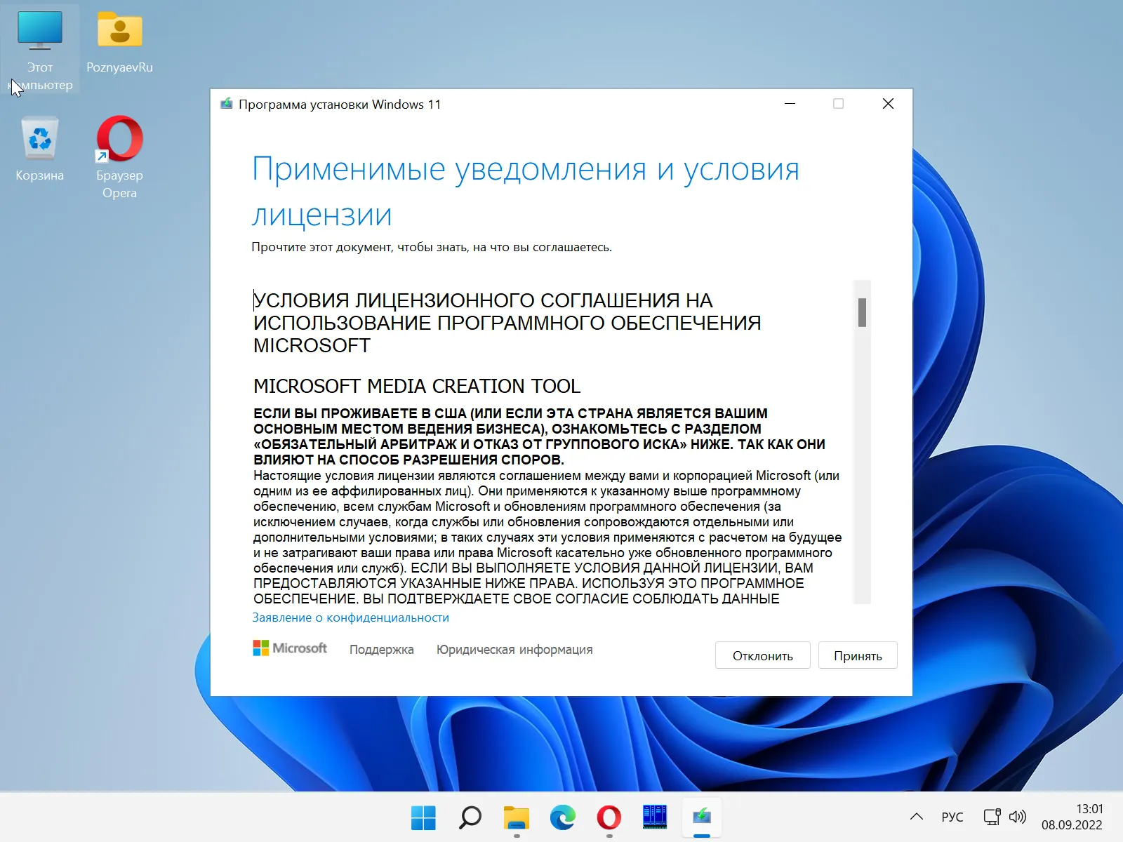 Дождитесь запуска «Программы установки Windows 11». Нажмите кнопку «Принять» под лицензионным соглашением.