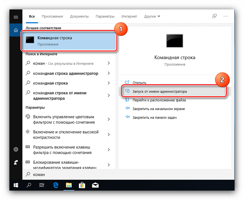 - Откройте «Поиск», в котором начните вводить запрос командная строка . Выделите найденное приложение и нажмите на ссылку «Запуск от имени администратора» в правой части окна.