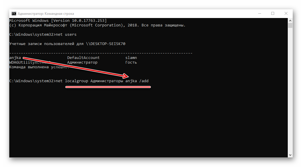 - Можно попробовать другой не менее эффективный способ. Необходимо открыть командную строку от имени админа. В окне требуется вписать net localgroup Администратор /add networkservice.