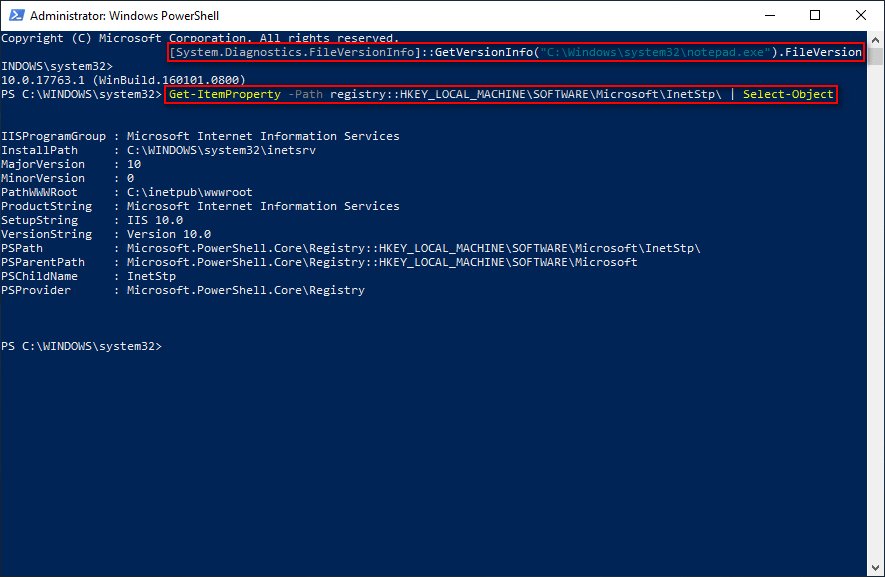 - Вы также можете ввести Get-ItemProperty -Path registry :: HKEY_LOCAL_MACHINE SOFTWARE Microsoft InetStp | Выбрать объект и ударил Войти .