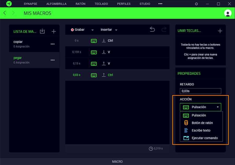 При создании макроса мы можем изменить его имя, а затем приступить к записи команд. Запись начинается через три секунды и показывает нам нажатые клавиши и сотые доли секунды, использованные для этого. Также на панели «Действие» справа мы видим, что созданный макрос назначен как « Клик», но мы также можем изменить его на кнопку мыши, текст или команду «Выполнить». Поскольку это можно сделать на панели назначений на самой мыши, вам не нужно изменять ее здесь.