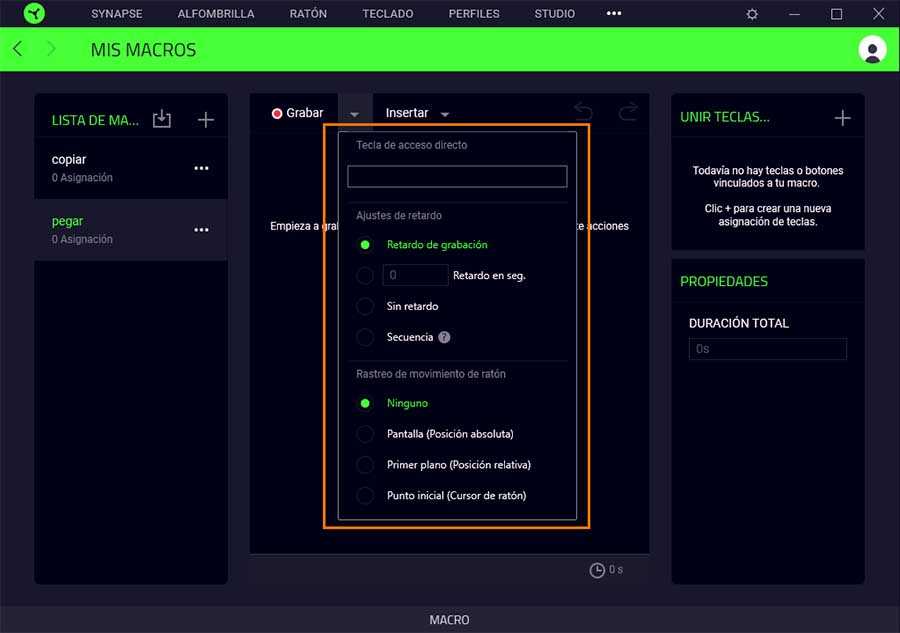 Увидев все предыдущие варианты, мы выбираем кнопку для редактирования и в появившемся списке выбираем Макро. Если вы создадите его впервые, список назначений макросов будет пустым, и вместо этого у вас будет ссылка «Конфигурировать макросы». Нажав на нее, вы попадете в модуль макросов. Вам нужно будет загрузить эту опцию, чтобы сделать ее доступной в Razer Synapse.