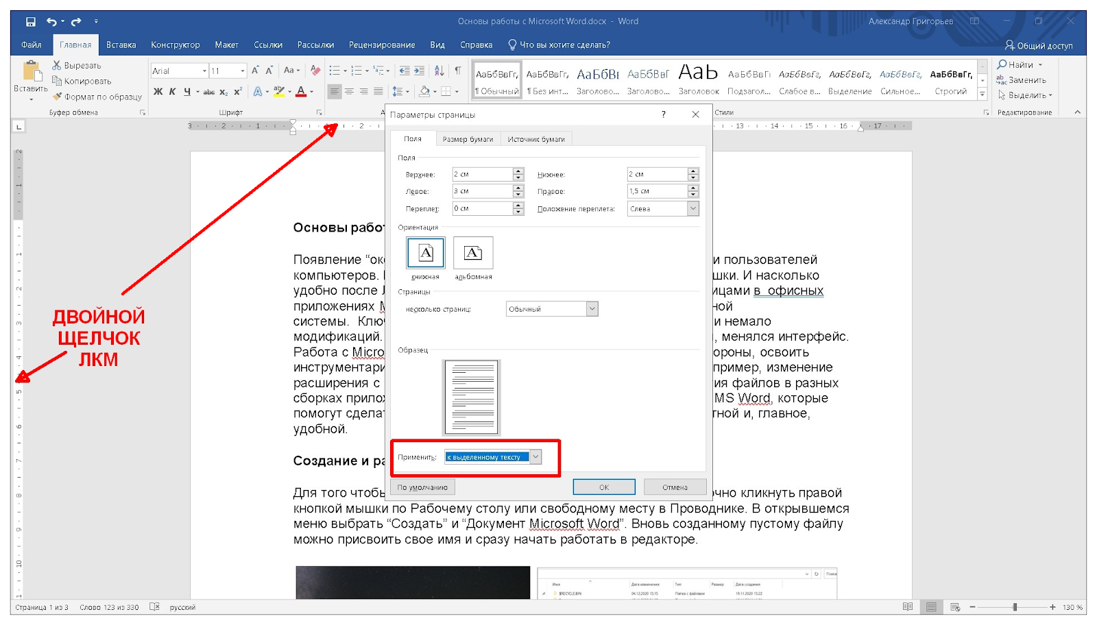 - Щелкаем два раза ЛКМ по левому или верхнему полю страницы с цифрами (“Линейка”). В открывшемся меню настраиваем базовые параметры страницы: