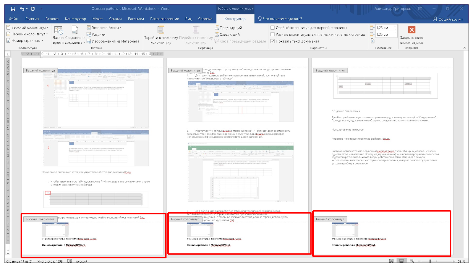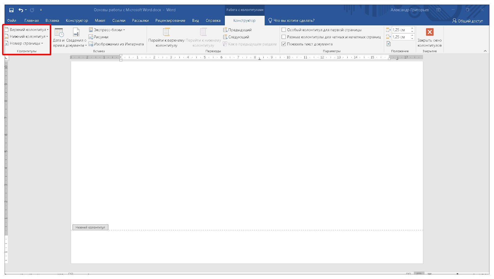 - Войдите в меню “Конструктор” и выберите нижний или верхний колонтитул, либо номер страницы. Доступны варианты форматирования колонтитулов.