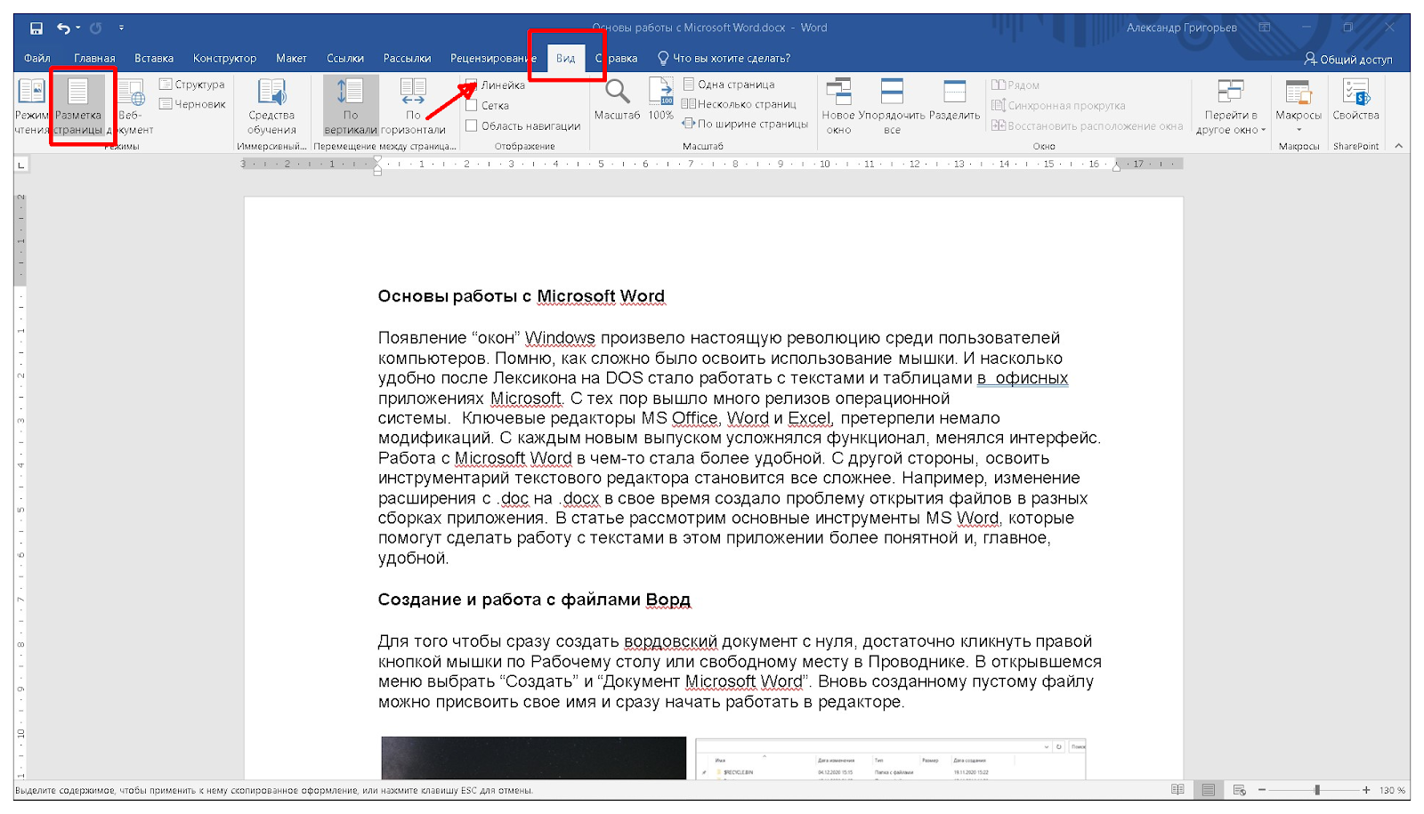 - В основном Меню открываем вкладку “Вид” и устанавливаем режим “Разметка страницы”. Ставим галочку в окошко напротив надписи “Линейка”.