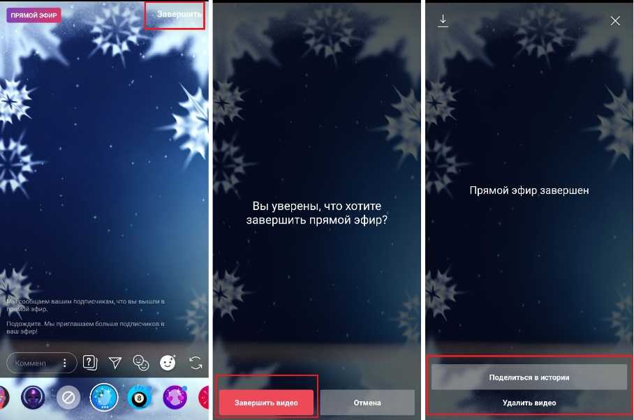 - Чтобы завершить вещание, нажмите на кнопку завершить, затем подтвердите свое намерение и выберите что вы хотите: удалить ролик навсегда или сохранить его в формате сториз.