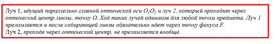 Пусть предмет АВ (на чертеже красная стрелка) рассматривается сквозь собирающую линзу. Выполняя чертеж, от каждой точки предмета строят два основных луча.