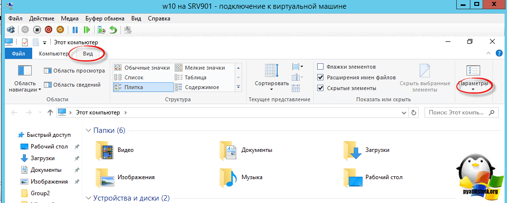 Как сделать, чтобы при вызове проводника, у вас открывался «»Этот компьютер» а не «Панель быстрого доступа». Для этого откройте любую папку, выберите вкладку «Вид» и «Параметры»