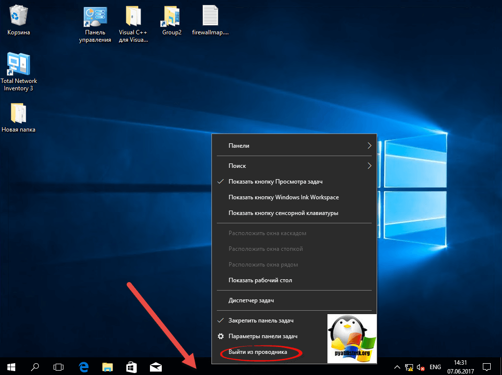 В восьмерке или Windows 10 найти пункт «Выход из Проводника» можно в области панели задач, удерживайте клавиши Ctrl и Shift и в пустом месте щелкните правым кликом, у вас появится меню с заветным пунктом.