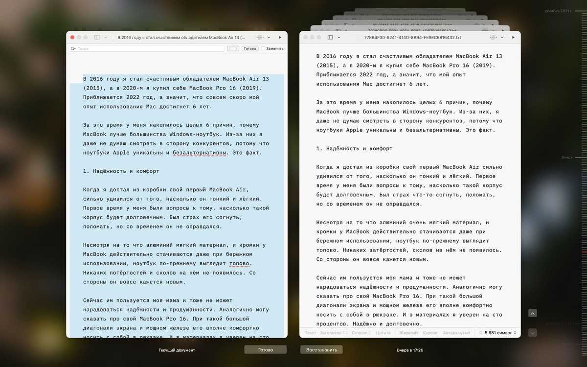 Ещё я часто пользуюсь на MacBook функцией «Вернуть к версии». Бывает, что я могу внезапно начать писать новость в документе, в котором работал над статьёй, и в любой момент могу вернуть документ к нужной версии. Потому что macOS незаметно делает резервные копии документов на разных этапах работы.