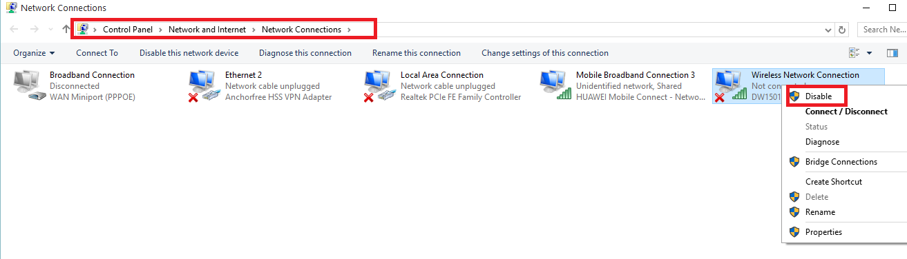 2. Click on Network and Internet and then click Network and Sharing Center. From the left pane click on Change adapter settings. Now click on Wireless Network Connection and select disable.