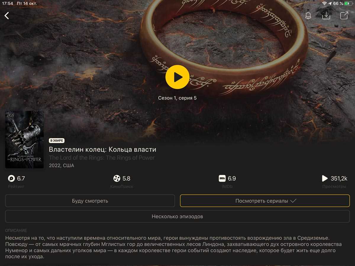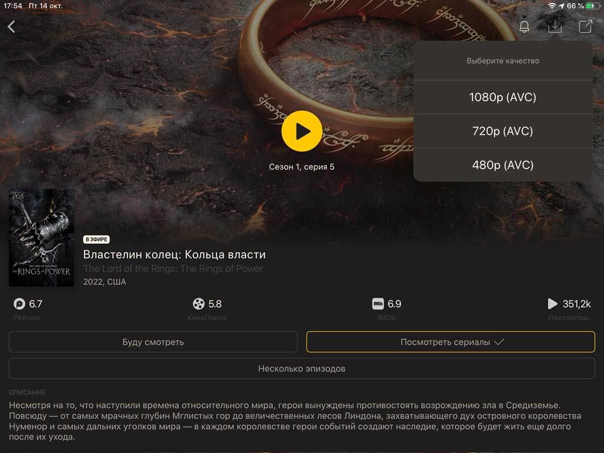 Мой любимый стриминговый сервис Kinopub позволяет загружать фильмы и сериалы для дальнейшего просмотра без подключения к сети, лишь бы места на устройстве хватало.