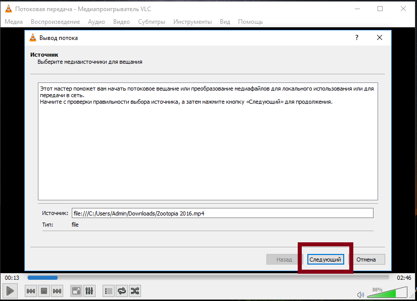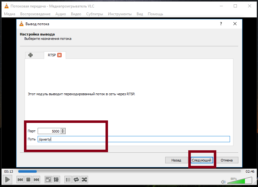 Для потоковой трансляции VLC использует порт 8080 – стандартный порт для прокси-серверов. Если этот порт закрыт или занят, его можно заменить на другой порт. Если с портом 8080 проблем нет, ничего не трогая, жмём кнопку внизу «Следующий».