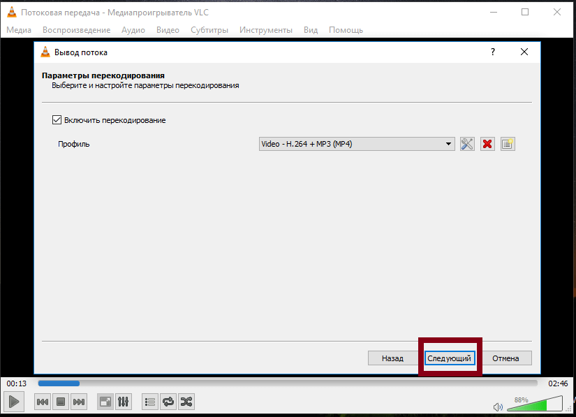 Если скорость Интернета оставляет желать лучшего, для передачи потока лучше прибегнуть к процедуре перекодирования в целях оптимизации передачи данных. Для этого в выпадающем списке «Профиль» выбираем либо «Video–MPEG-2+MPGA(TS)», либо «Video–H.264+MP3(TS)». Последний будет передавать видео в чуть лучшем качестве, чем первый, но оба они, естественно, качество видео, в отличии от исходного, ухудшат.