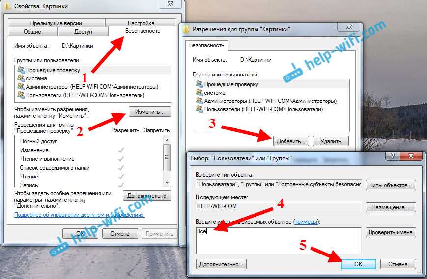 Рядом с вкладкой “Доступ” есть “Безопасность”. Здесь нажмите кнопку “Изменить”, а в новом открывшемся окне “Добавить”. В пустом окошке впишите слово “Все”, как показано на фото: