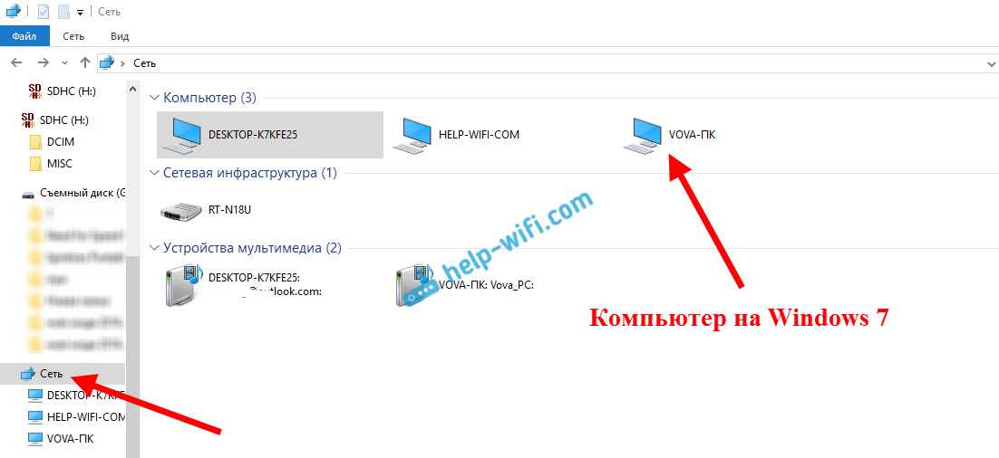 Все, локальная сеть между компьютерами уже работает. Открываем проводник (Этот компьютер), переходим слева на вкладку сеть, и видим компьютеры в локальной сети. Мы можем открывать их, и просматривать папки, к которым открыт общий доступ. Компьютер с Windows 10 без проблем видит в сети компьютер с установленной Windows 7.