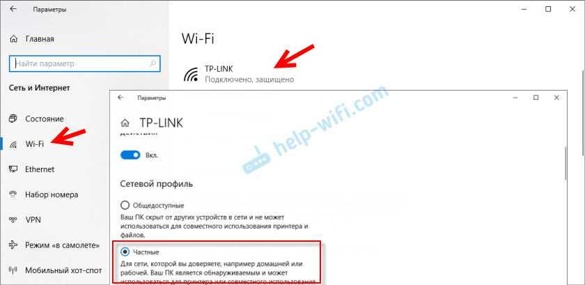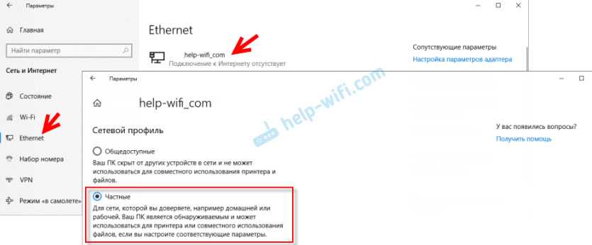 Для настройки локальной сети я рекомендую для Ethernet или Wi-Fi подключения установить сетевой профиль «Частные». Ну и соответственно открывать общий доступ к файлам только в тех сетях, которым вы доверяете (которые вы контролируете). На тему смены сетевого профиля я уже писал подробную инструкцию: домашняя (частная) и общественная (общедоступная) сеть Windows 10.