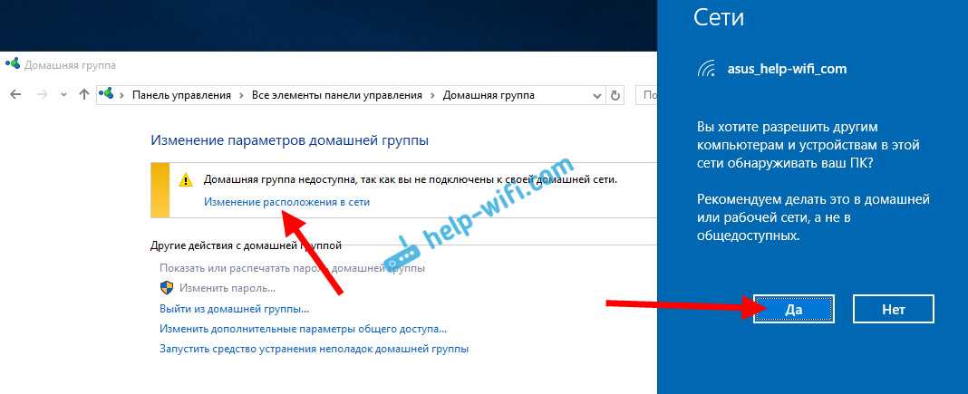 Если у вас будет сообщение «Домашняя группа недоступна, так как вы не подключены к своей домашней сети.», то нажимаем на Изменение расположения в сети, и нажимаем на кнопку Да.