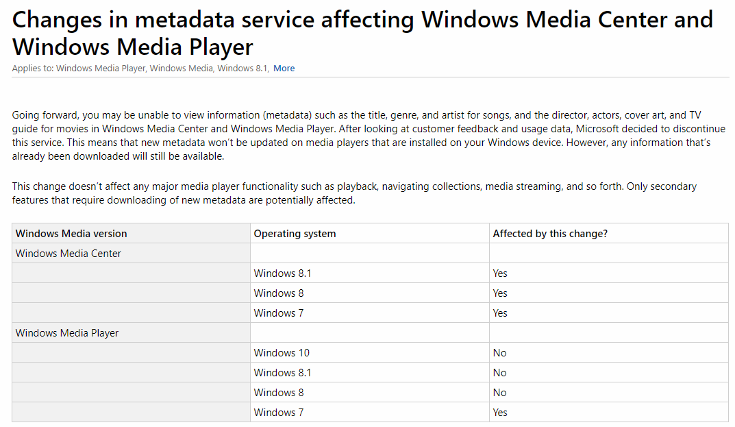 Microsoft удалила функцию обновления метаданных во встроенных в операционную систему Windows 7 медиаплеерах Windows Media Player и Media Center. Последний также лишится поддержки описанной возможности в ОС версий 8 и 8.1. Это означает, что новые дополнительные сведения о кинофильмах и музыкальных альбомах, такие как изображения обложек компакт-дисков, имена актеров и режиссеров, а также прочие типы метаданных, не будут загружаться из Сети и отображаться на экране во время воспроизведения контента. Ранее загруженные метаданные останутся в распоряжении пользователя.