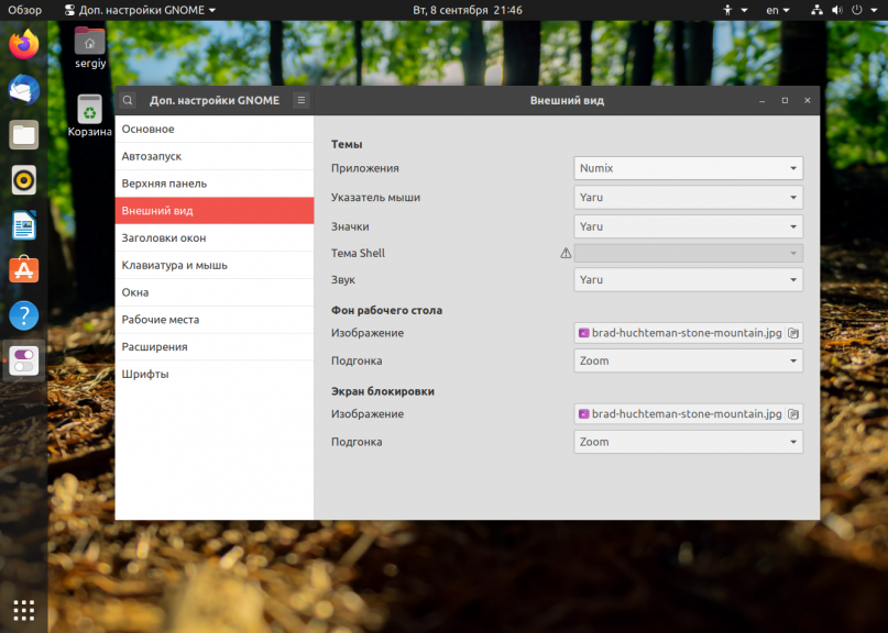 Откройте раздел Внешний вид, здесь вы можете настроить тему GTK, значков, курсоров и оболочки. Просто выберите нужную тему из списка. Если тема была установлена правильно, то она будет в списке. Например, Numix: