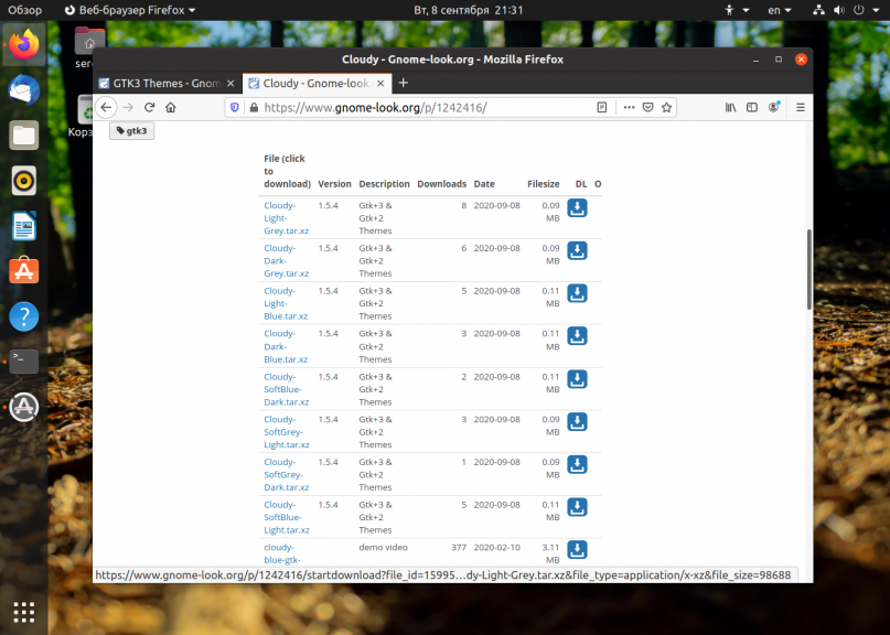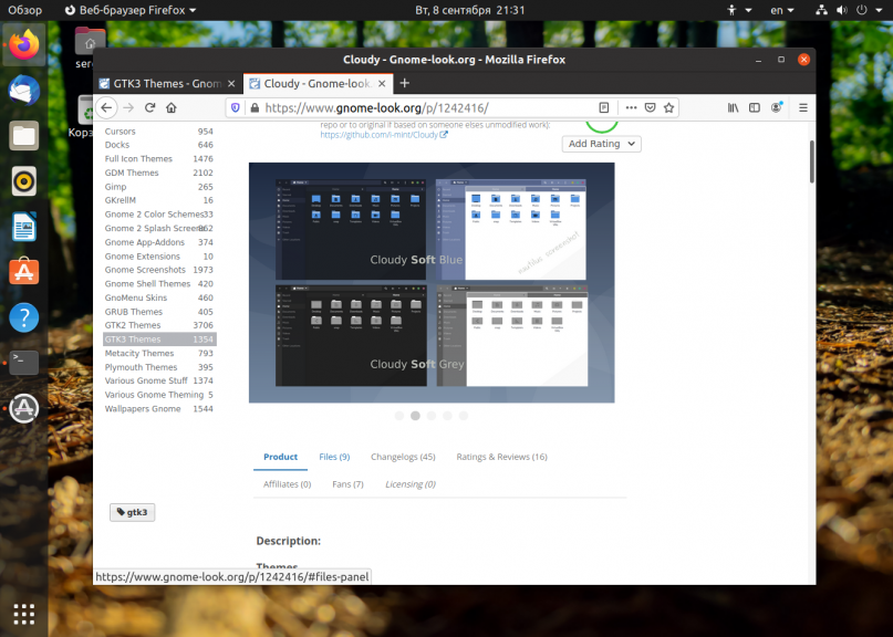 Установка тем в Ubuntu может выполняться не только через PPA. На сайте gnome-look.org доступно огромное количество тем, которые вы можете установить и использовать. Рассмотрим установку на примере темы Cloudy. Сначала перейдите на страницу темы. На первой странице находятся снимки экрана и небольшое описание темы. Также здесь могут находится инструкции по установке на английском: