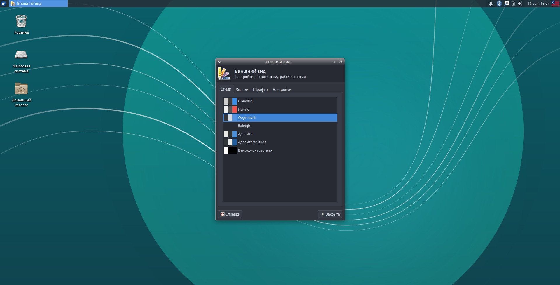 На вкладке Стили вы можете изменять GTK-тему. Я установил Qogri-dark: