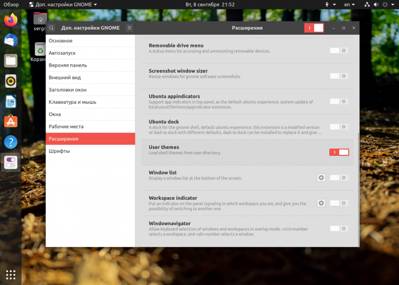 Затем активируйте расширение User Themes на вкладке Расширения:
