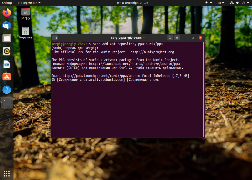 Чтобы установить тему Arc, откройте окно терминала и выполните следующую команду. Введите свой пароль и введите «Y» для подтверждения, когда будет предложено:
