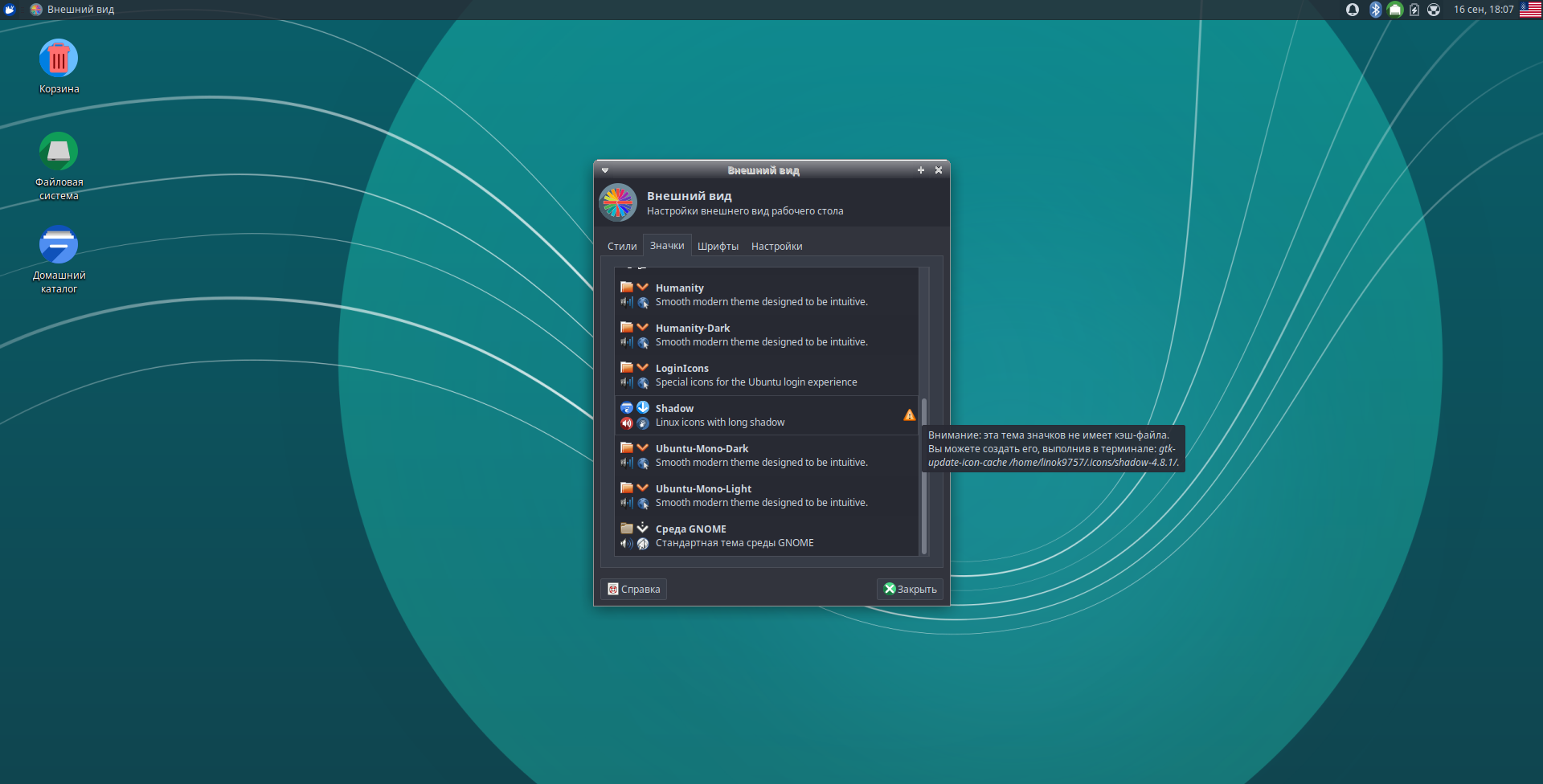 Обратите внимание, что если вы устанавливали тему вручную, программа вас предупредит об отсутствии кэш-файла и укажет команду, которую вам нужно выполнить в терминале, чтобы создать этот самый файл: