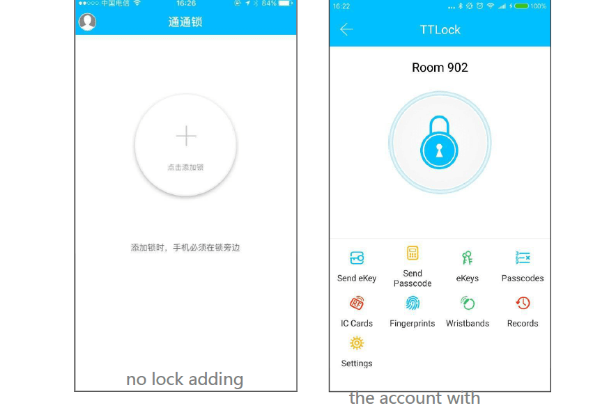 Успешный вход в систему: при первом использовании приложения блокировки на домашней странице будет отображаться кнопка для добавления блокировки, если в учетной записи нет данных блокировки или ключа. Информация о блокировке будет отображаться, если в учетной записи есть замок или ключ.