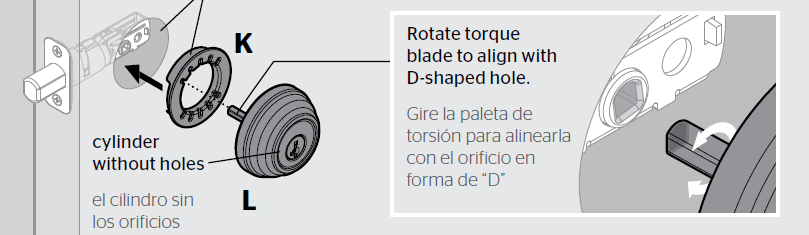 - Сцепление выключено: Снимите внутреннюю сборку с двери. Убедитесь, что замок легко открывается ключом, когда внутренняя часть снята. Попытайтесь повернуть поворотную деталь на внутреннем узле. Если он не вращается плавно, сцепление отключается. Поверните поворотную часть на 180° по часовой стрелке (вам нужно будет приложить усилие при вращении, и вы услышите щелчок). Это снова включит сцепление. Совместите поворотную деталь с крутящим моментом и установите внутренний узел на дверь.