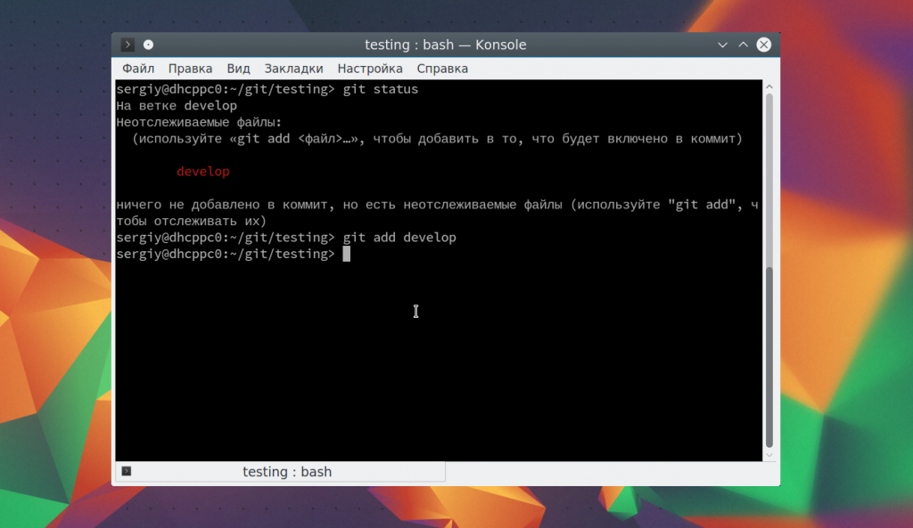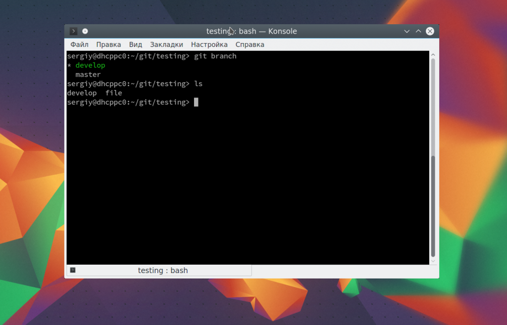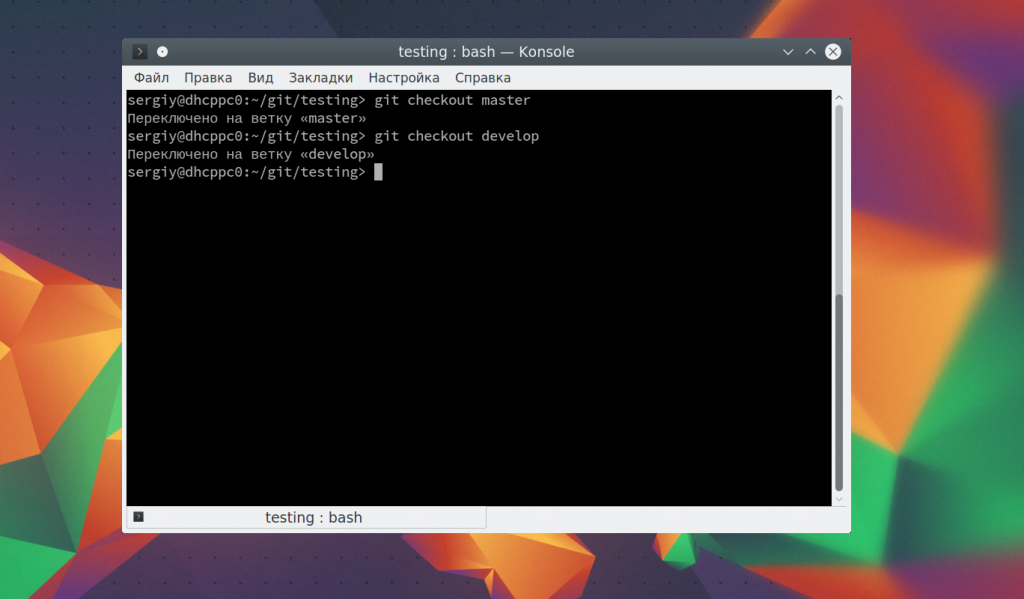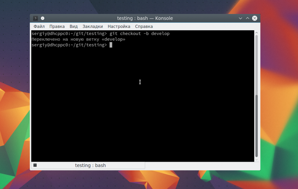 Опция -a указывает что нужно вывести все ветви, даже не синхронизированные. Звездочка указывает на активную ветвь. Теперь создадим ветвь для разработки с помощью команды checkout:
