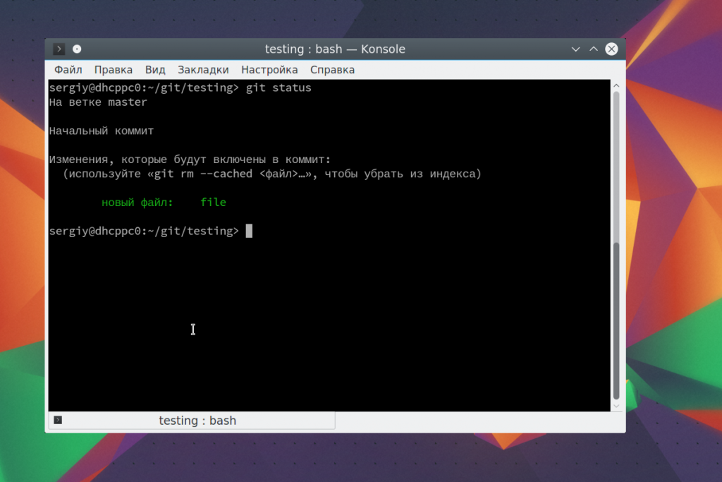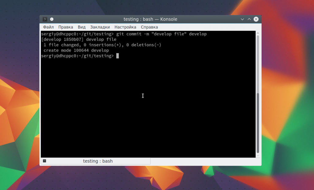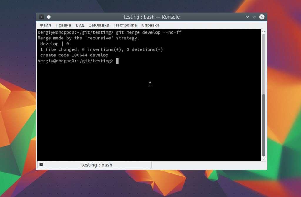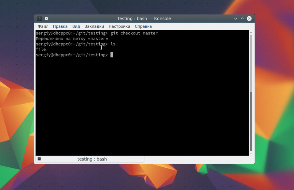 Перед тем как будет выполнено слияние вам нужно ввести комментарий, зачем это нужно. Затем если вы еще раз выполните ls, то увидите, что здесь уже есть нужный файл. Наши примеры git подошли к концу.