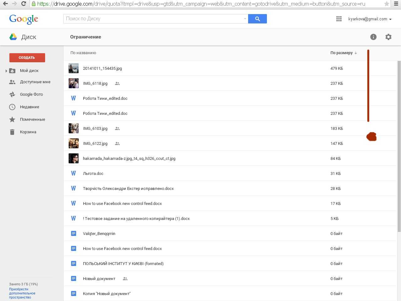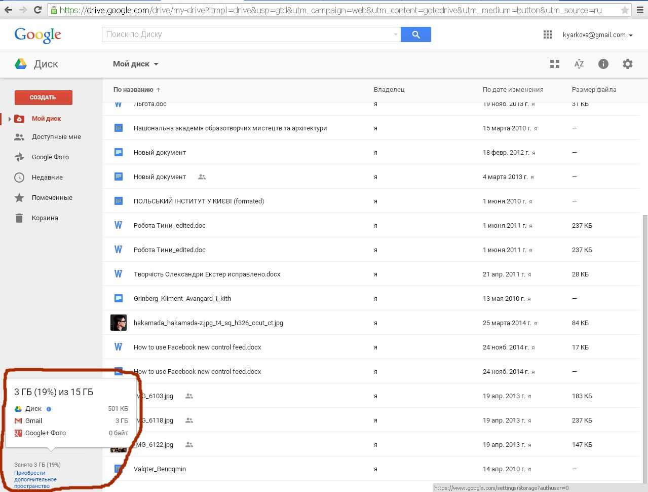 Не всё, что находится в Google Drive, засчитывается в лимит хранилища. Поэтому не стоит удалять все файлы без разбора. Контент, созданный в Google Документах (Google Docs), Таблицах (Google Sheets) или Презентациях (Google Slides) не засчитывается в лимит диска (как и любой подобный файл, которым поделились с вами). Практически всё, что находится в Gmail, считается. Фото, размер которых превышает 2048х2048 пкс и видео, длиннее 15 минут в Google+ Photos засчитываются в лимит Google Drive.