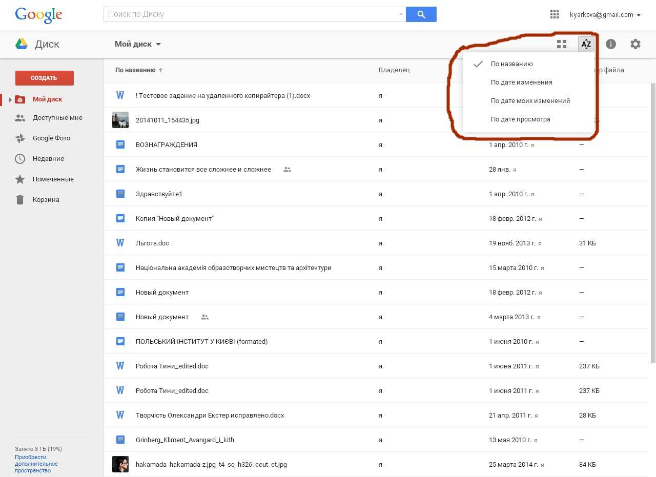 После этого файлы на Google Drive сортируются по имени. Обычно Google предлагает сортировку по размеру файла, но если выбрать Сортировать в правом верхнем углу вы увидите, что также можно отсортировать файлы по названию, дате изменений, дате последнего просмотра и пр.