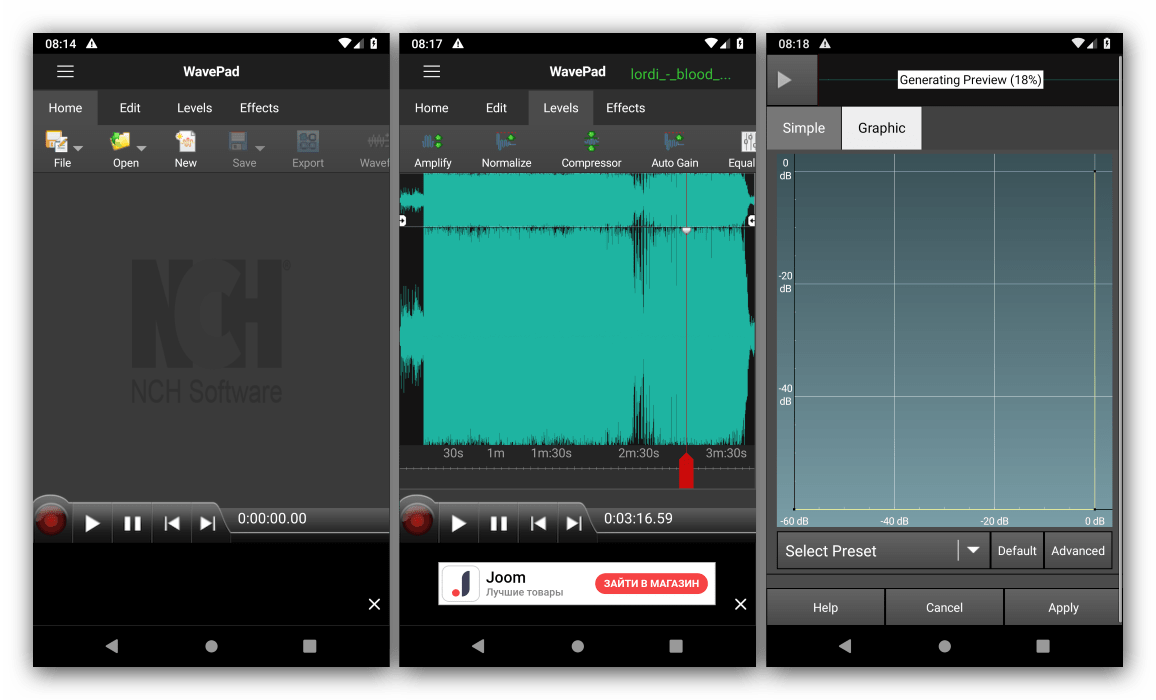 Доступна обрезка трека, удаление фрагментов, добавление или уменьшение громкости, а также наложение эффектов. Из дополнительных функций есть только диктофон и средство просмотра метаданных загруженного файла. Недостатков у приложения тоже немного – время от времени показывает рекламу, имеет в себе платный контент, плюс не переведено на русский.