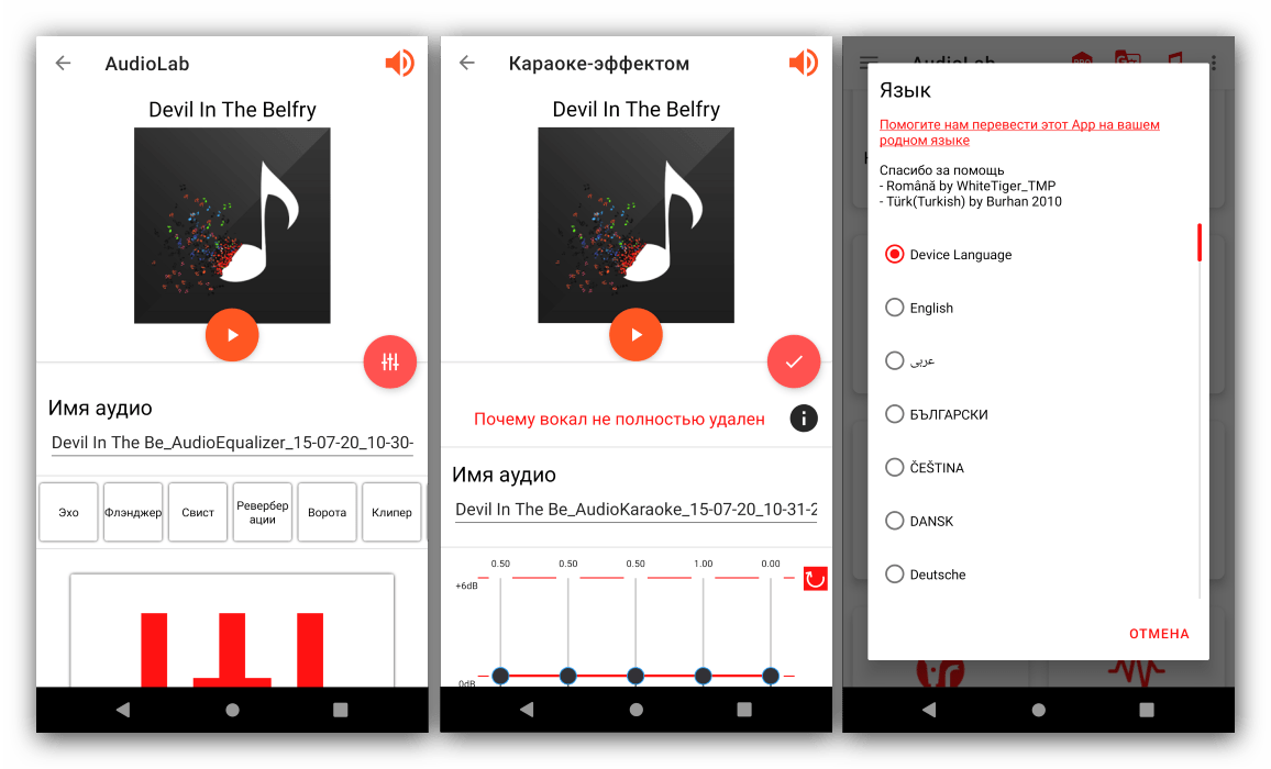 В наличии и дополнительные функции – например, с помощью АудиоЛаб можно преобразовать текст в речь (и наоборот), изменить голос в треке или вообще его вырезать (работает не со всеми файлами), удалить шум и посторонние звуки (например, в live-записи). Также в приложение встроен вполне удобный музыкальный проигрыватель с современным интерфейсом. Увы, не обошлось и без минусов – часть функций всё-таки требует оплаты, да и перевод на русский оставляет желать лучшего. Однако разработчики в курсе последнего и оставили в программе возможность смены языка не лету.