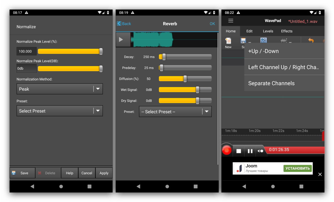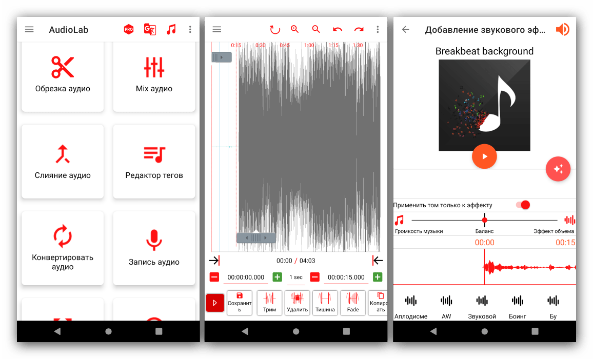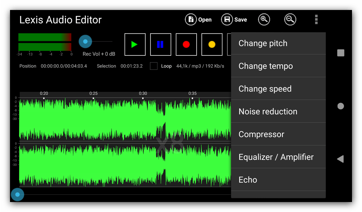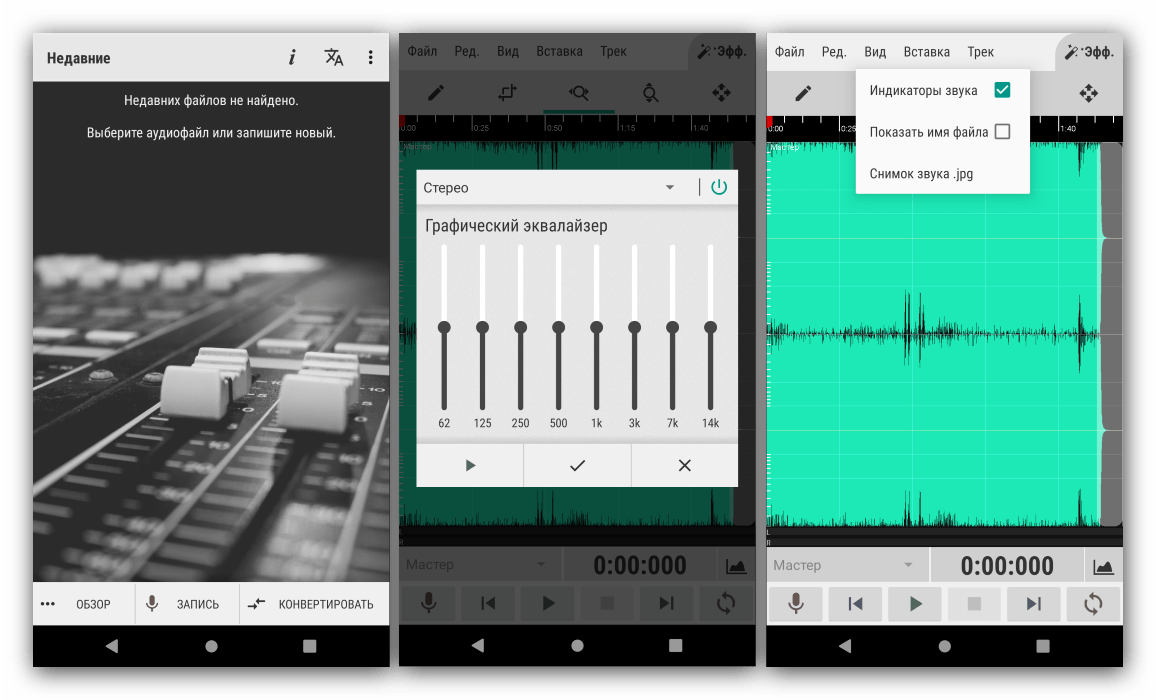 Один из самых продвинутых, и в то же время удобных аудиоредакторов для Android. Это одно из немногих бесплатных решений, в котором присутствует инструмент для работы с волноформой. Остальные возможности тоже на высоте: средства редактирования треков вроде убирания шумов, обрезки и вставки дублированных участков, а также продвинутые опции наложения эффектов (например, реверберации).