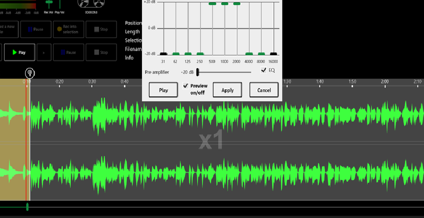 Присутствует CD-Grabber с возможностью конвертирования сразу в mp3, есть возможность применения цепи сразу нескольких эффектов (Tool>Effect chain editor) и есть возможность конвеерной обработки файлов (File>Batch processing). Все эффекты предварительно прослушиваются (рис. 2), а затем применяются (как ко всему файлу, так и к выделенному фрагменту).