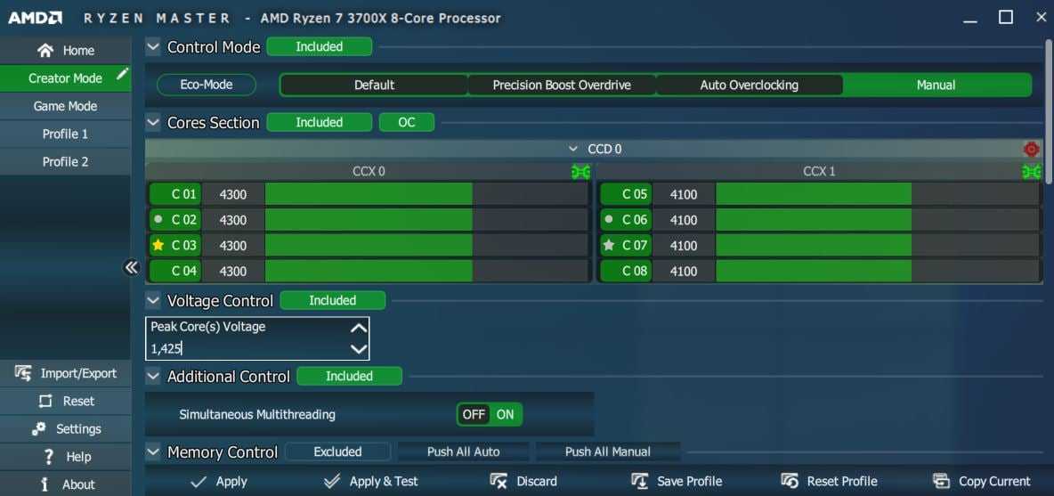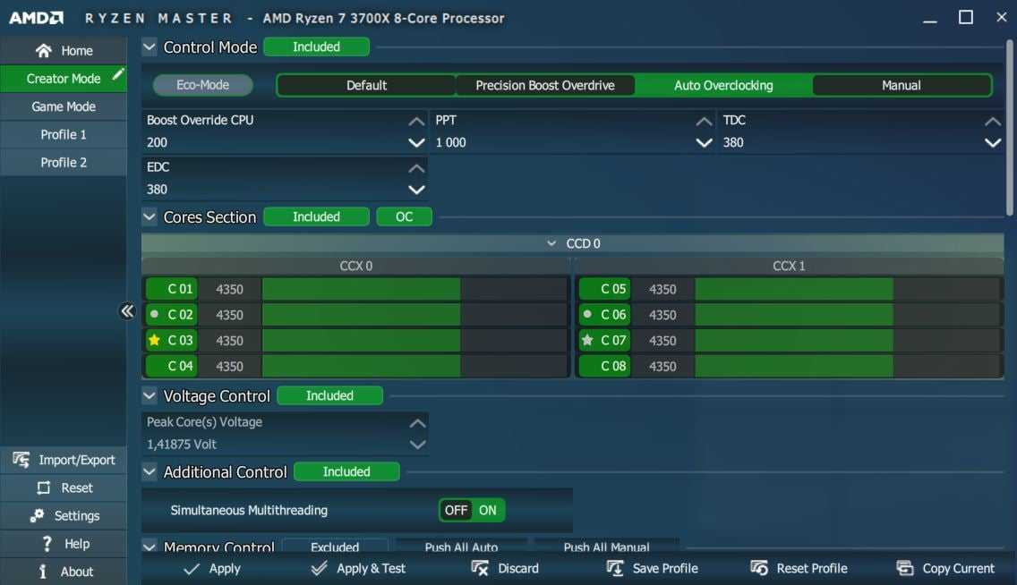 В нашем процессоре 3700Х таких блоков два и один из них обладает более удачными ядрами, на нем мы и попробуем увеличить частоту выше общих 4300 МГц.