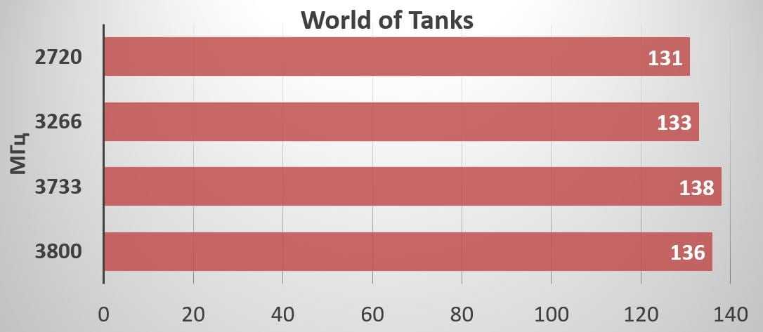 В игровых тестах увеличение частоты оперативной памяти также не оказывает в нашем случае значительного влияния на прибавку FPS. Разница укладывается в погрешность измерений: 2-3 кадра в секунду. Можно только вспоминать о значительной прибавке производительности в играх – до 20% при разгоне памяти на Ryzen первого поколения.