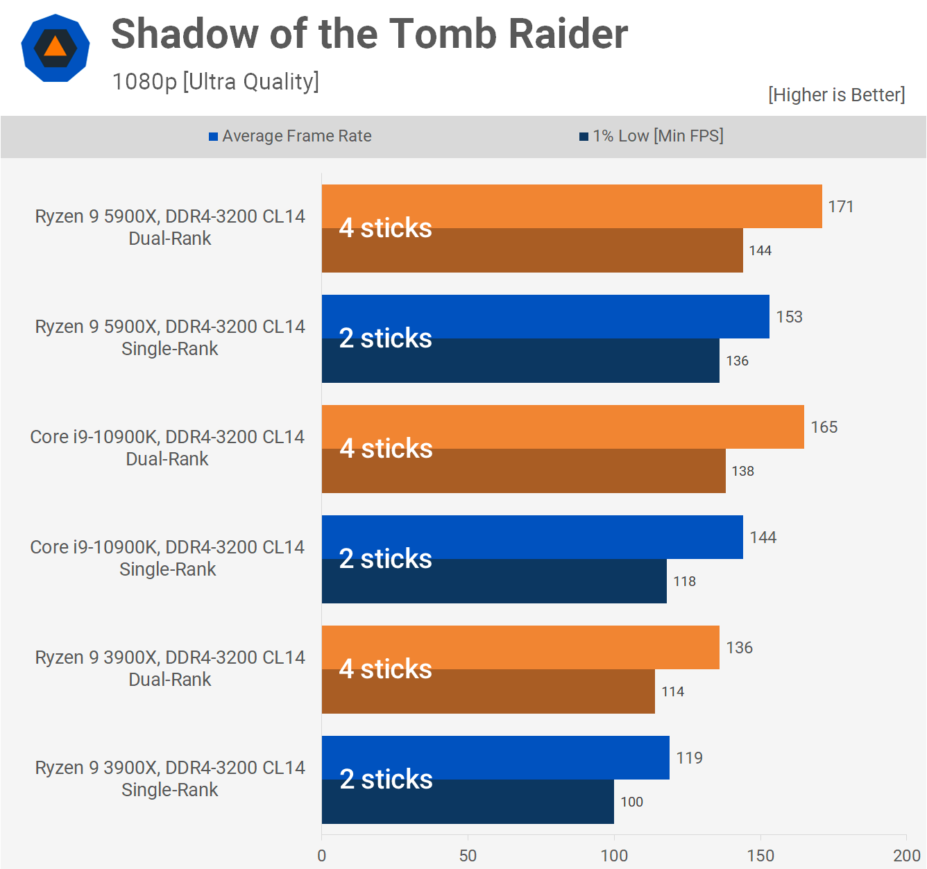 Игра Shadow of The Tomb Raider очень требовательна к процессору. Модель 3900X показывает прирост средней частоты кадров на 14%, когда используются четырёх планки памяти вместо двух. Это значительный шаг вперёд, хотя нужно отметить использование мощнейшей видеокарты и низкое разрешение экрана.