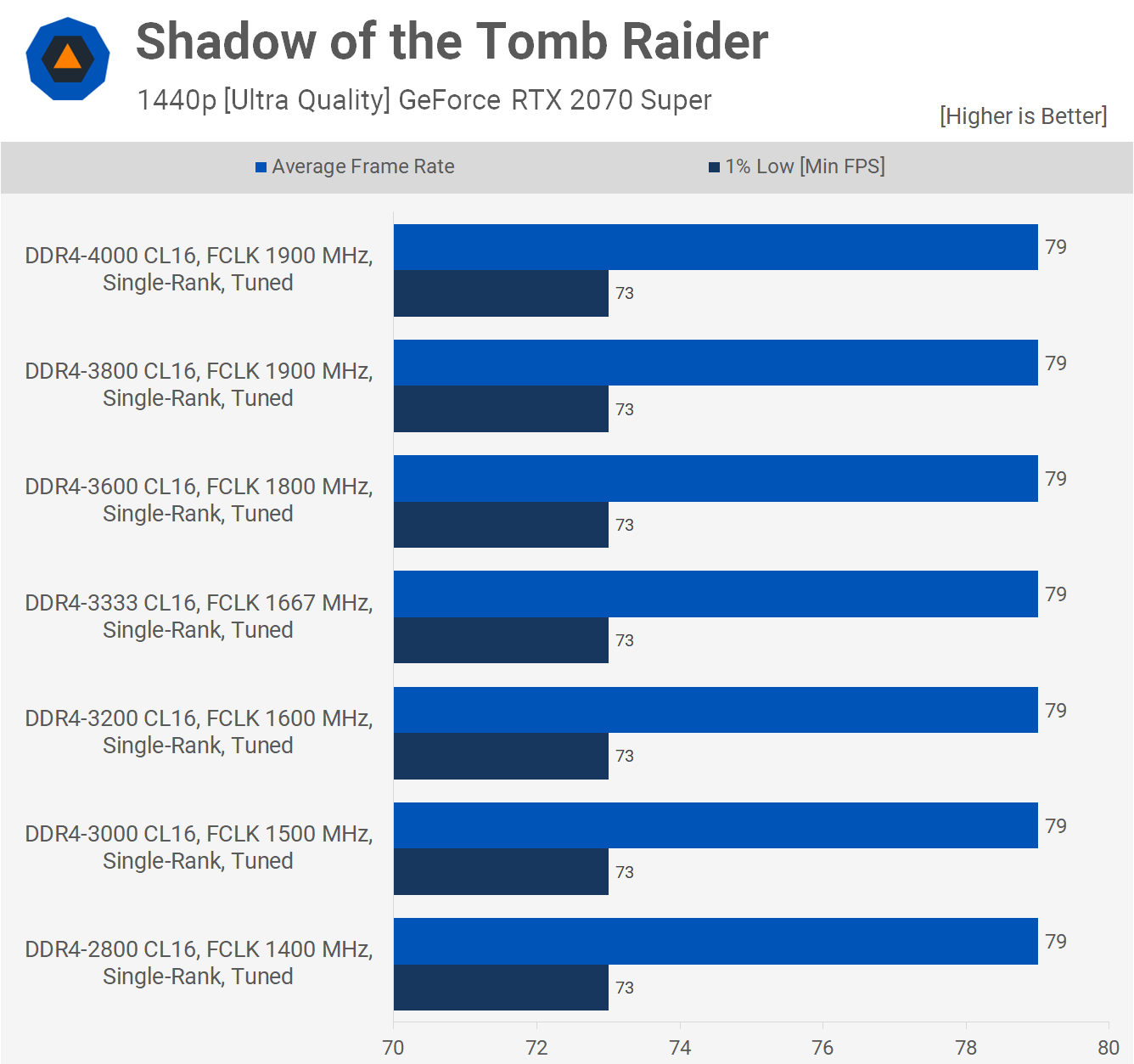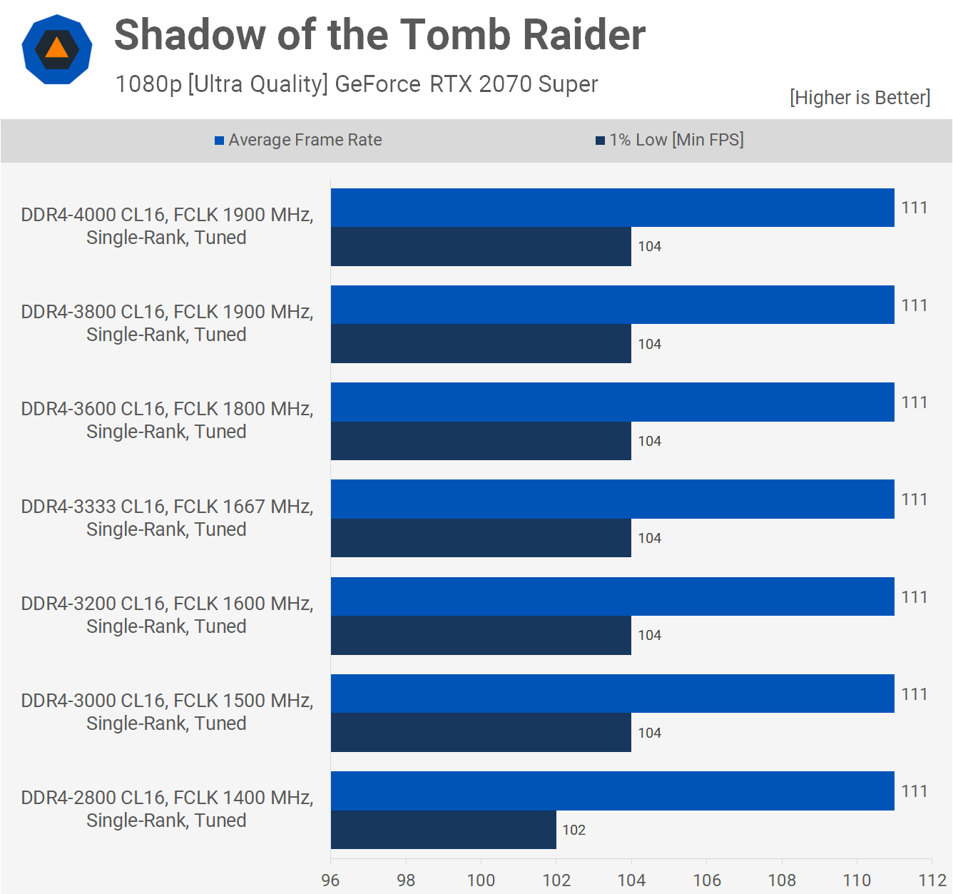 Повышение разрешения уменьшает разницу между результатами и тогда уже неважно, будет у вас память DDR4-2800 или 3800. В этой зависящий от центрального процессора игре скорость будет одинаковая