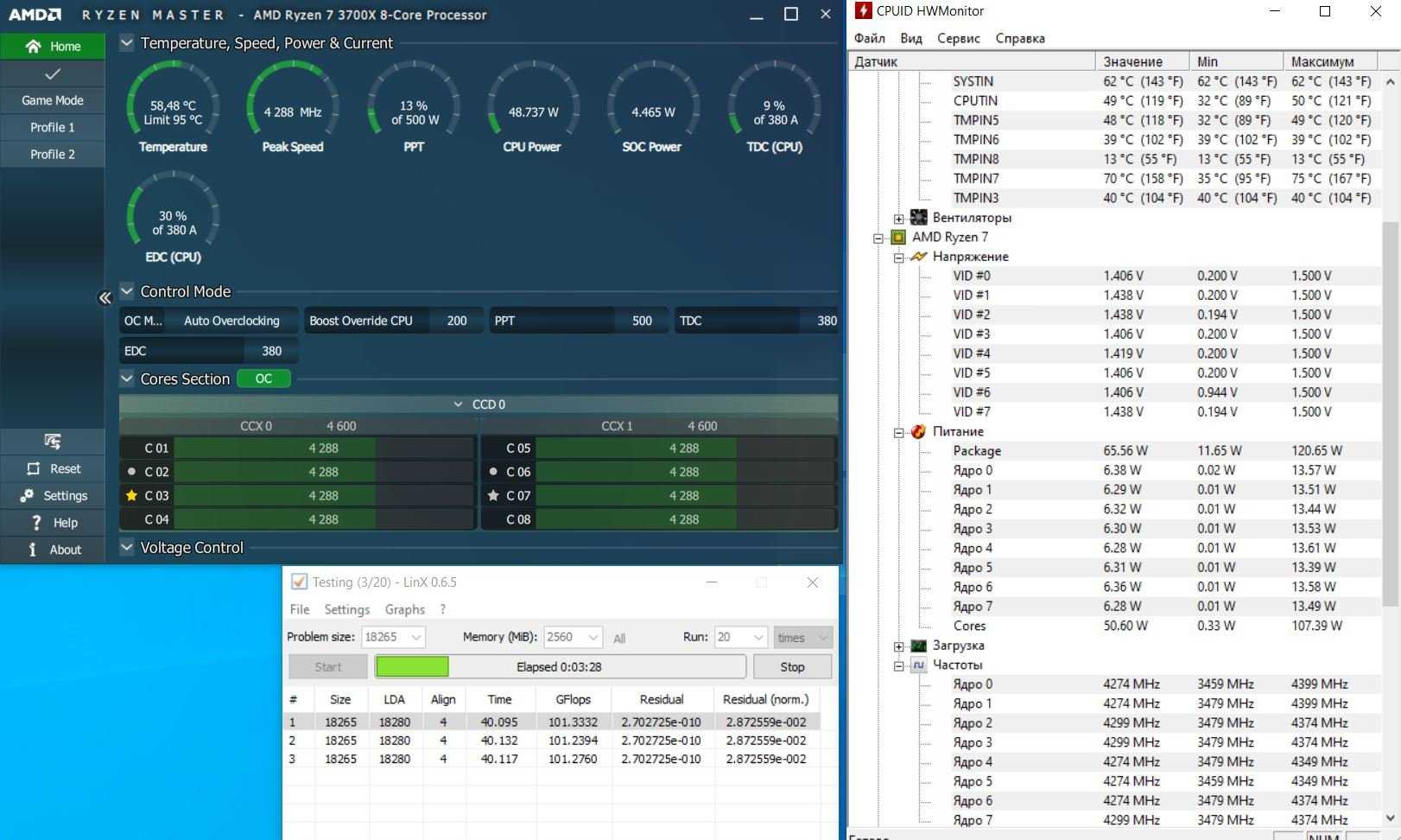 В результате нам удалось поднять частоту всех ядер до 4.3 ГГц с напряжением 1.42 В. На данной частоте система работала стабильно, проходила все тесты без ошибок.
