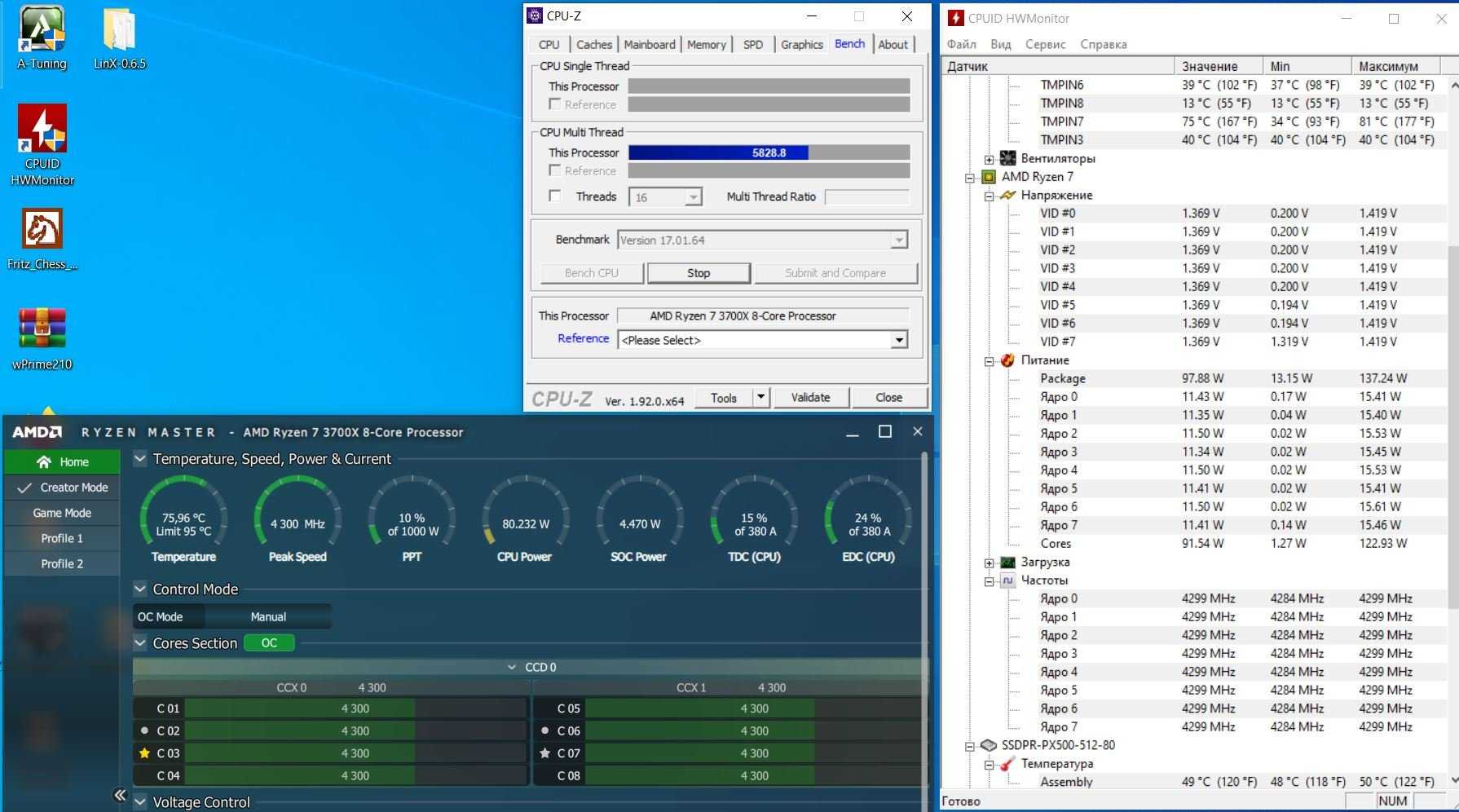 При раздельном разгоне каждого исполнительного блока CCX мы получили такие же результаты: 4350 и 4300 МГц соответственно.