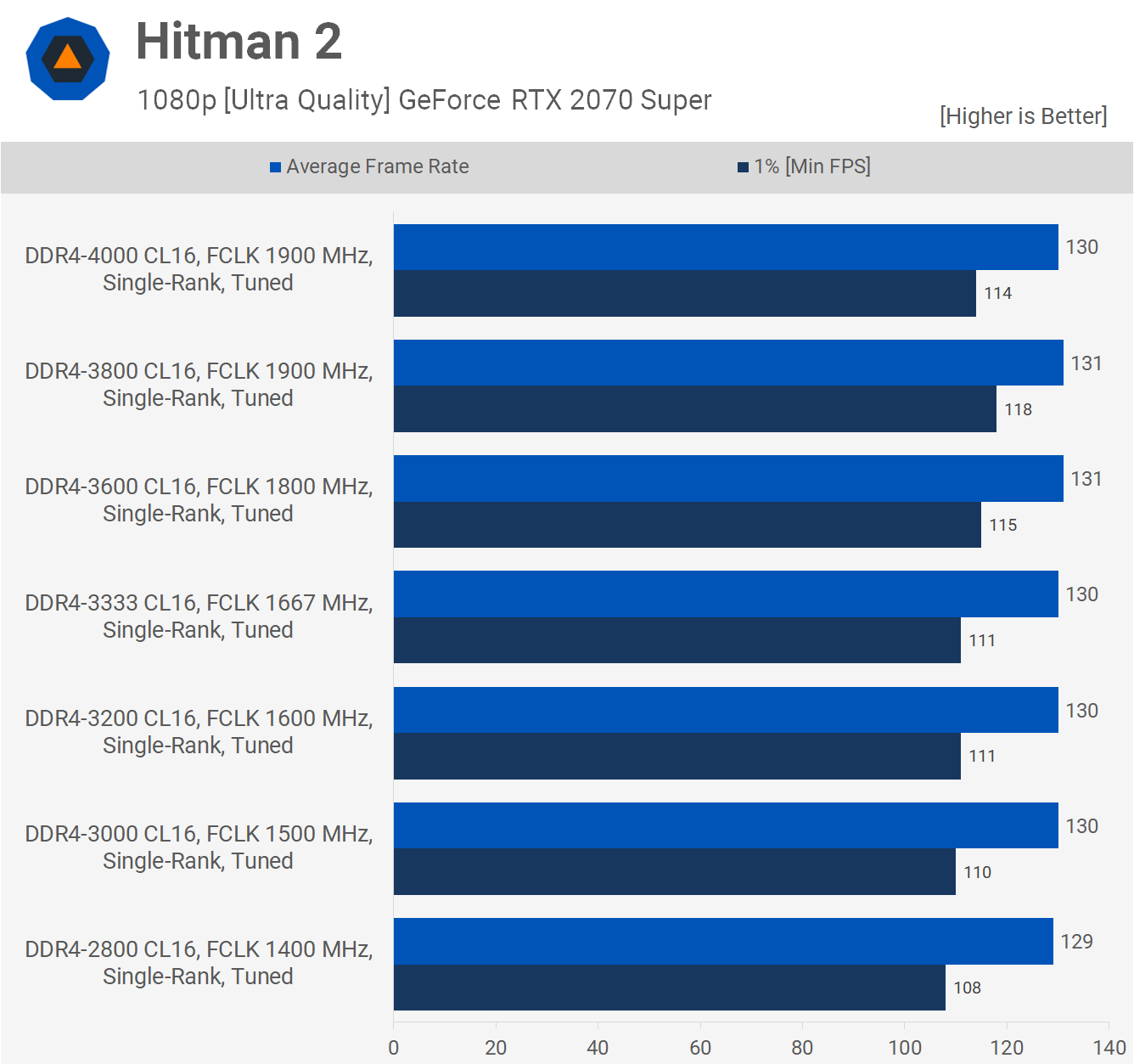 Игра Hitman 2 может показывать немного странные результаты. Возможно, при использовании процессора 3900X узким местом является задержка ядер, а не производительность памяти. Если посмотреть на процессор 5900X, нижняя производительность увеличивается на 21%. Опять же, виновата может быть видеокарта. Вывод такой, что 10900K и 5900X показывают сходный прирост производительности с четырьмя планками памяти и это относится не только к архитектуре Zen 3.