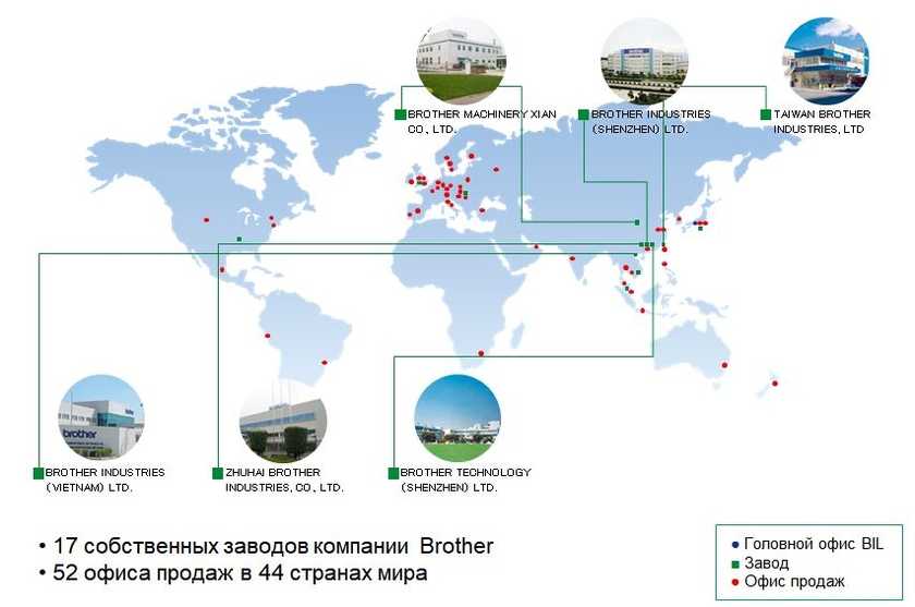 Brother Industries производит механические швейные машины в Чжухае , Китай, и компьютеризированные швейные и вышивальные машины на Тайване . В 2012 году в провинции Онгнаи , Вьетнам, был открыт новый завод по производству швейных машин , который является крупнейшим в мире производителем швейных машин, специализирующимся на производстве швейных машин.