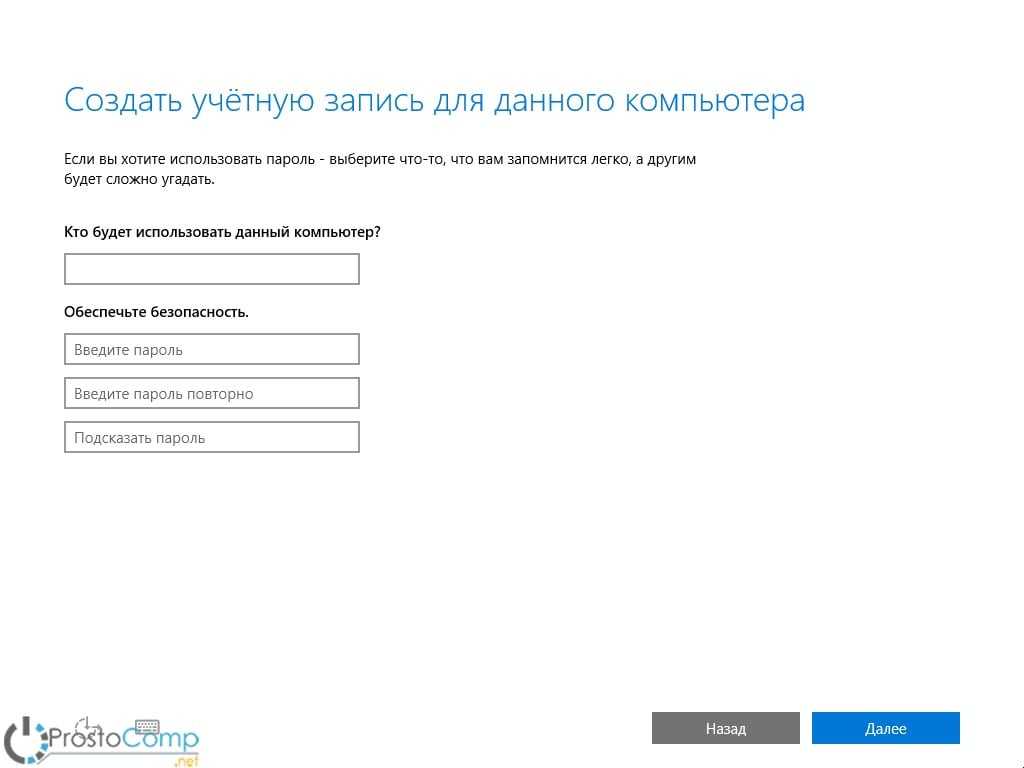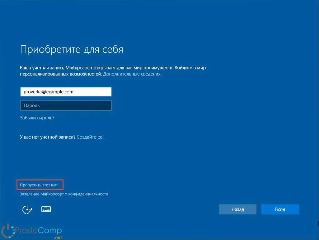 В любом случае, можно и отказаться от использования учетной записи через сервисы Microsoft и спокойно использовать систему через запись локального пользователя. Для создания локальной учетной записи, во время установки системы, просто пропустите шаг, где нужно ввести данные для входа в запись Microsoft.